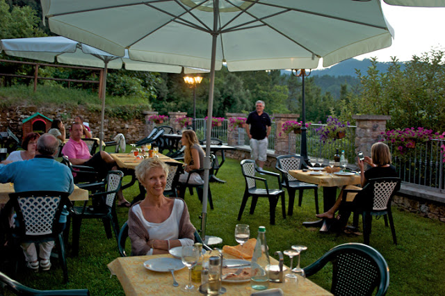 while being entertained by Daniela who's ability with languages is second to her talents as a stand-up comedienne. There are perhaps 10 tables, with 16 diners from at least 4 countries and she has us all in stitches. Not to mention her husband, who most of the time - while making the most amazing pizzas right there in the garden in the wood burning oven - looks like a surly lout, until Daniela, telling us all how he never smiled until he met her, at which his face is transformed by an ear to ear grin.