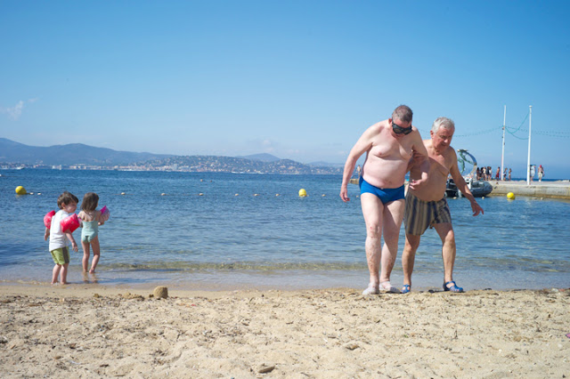 The little beach in front of the hotel, which gave us so much pleasure when viewed from the terrace, gave us a different kind of pleasure up close. Unlike the commercial beaches, this one is St.Tropezienne. The first afternoon we spent on it, we were moved to tears by life at its tenderest.