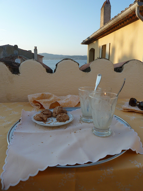After dinner we'd order 2 large coupes of vanilla ice-cream to be sent up, these accompanied by the most delicious chewy macaroons, which we devour all the while gazing out to sea, gasping in delight as an old-fashioned vessel sailed into view...