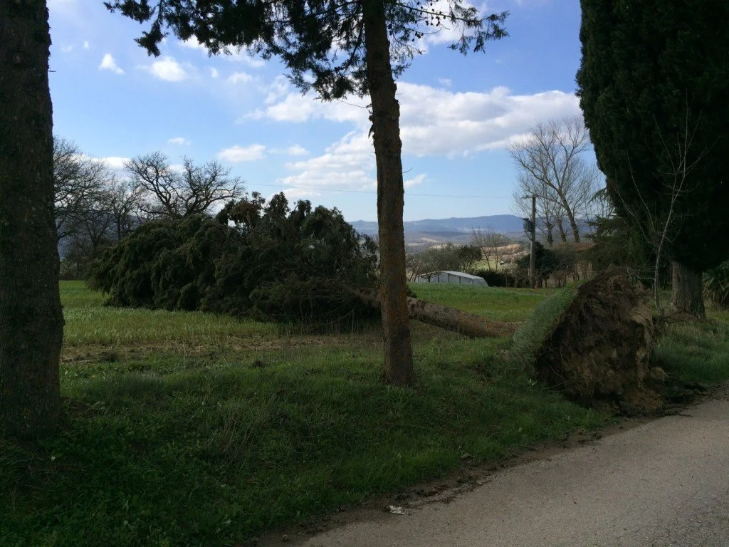 On Friday, not satisfied with wind, nature added an ice storm to the mix causing a power outage in Florence, while here the wind continued its mischief, tearing the roof off of Silvia and Vincenzo’s woodshed. But our new trees held their ground. It will be another week before I know how much clover seed was washed away. Sun is forecast for the next few days and that which remains will start to push its three-leafed greenery through the soil. Of course, I’ll re-sow the bare patches, sticking my tongue out at Mother Nature behind her back, while she laughs behind mine.