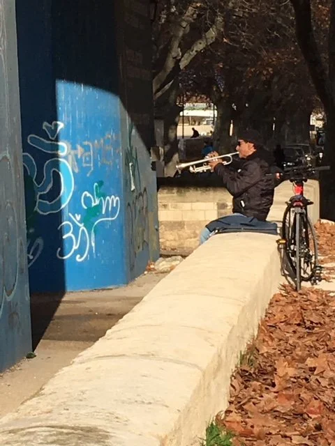 Or the memory of the trumpeter in Arles playing the blues.