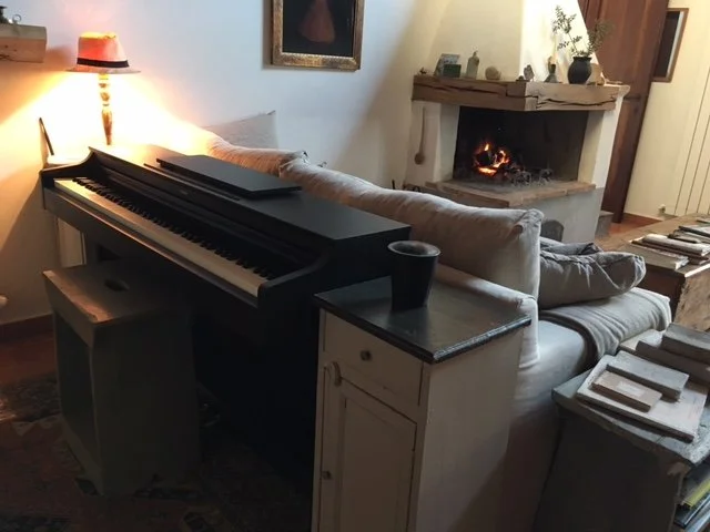 When Joel and I made the commitment to living here year round, nearly 3 years ago, it happened very quickly and we had to make a lot of fast decisions and choices in order to turn the place from a well renovated but spare barn into a home. Some of these choices we made in the 2 weeks left between being summer residents here and the 3 winter months we were about to spend in Provence. During those 2 weeks we designed a fireplace, chose a bathtub and ordered 2 couches and a sofa bed. Once in Provence we hunted for antiques to truck back to Tuscany in the spring, along with a cheap, portable digital piano. I considered the piano and the couches to be placeholders.