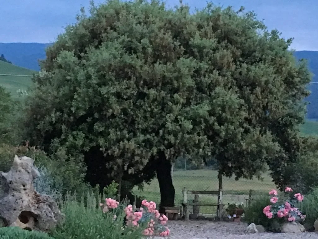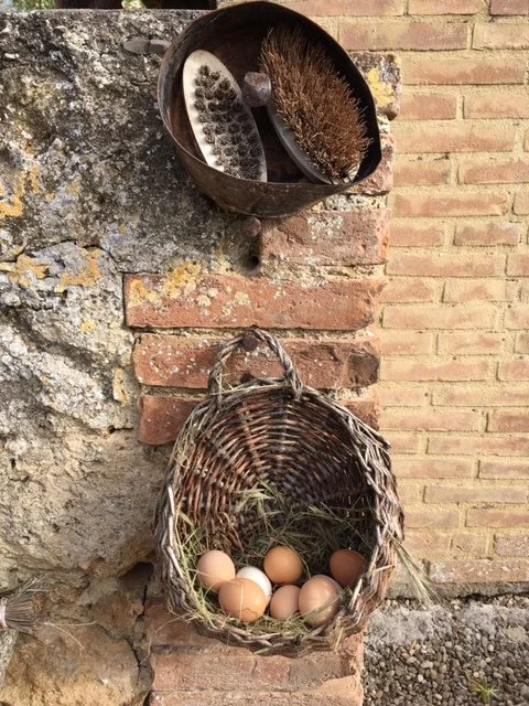 Now, as I sit in the dondolo (the outdoor divan-swing) a brief, sudden wind shakes the l’eccio trees and dried leaves rain down with a pitter-patter. Birds, nesting in the hedgerows are ceaseless in their chatter; a cock crows is cock-a-doodle-do and I am instantly here in the way in which I most love to be.