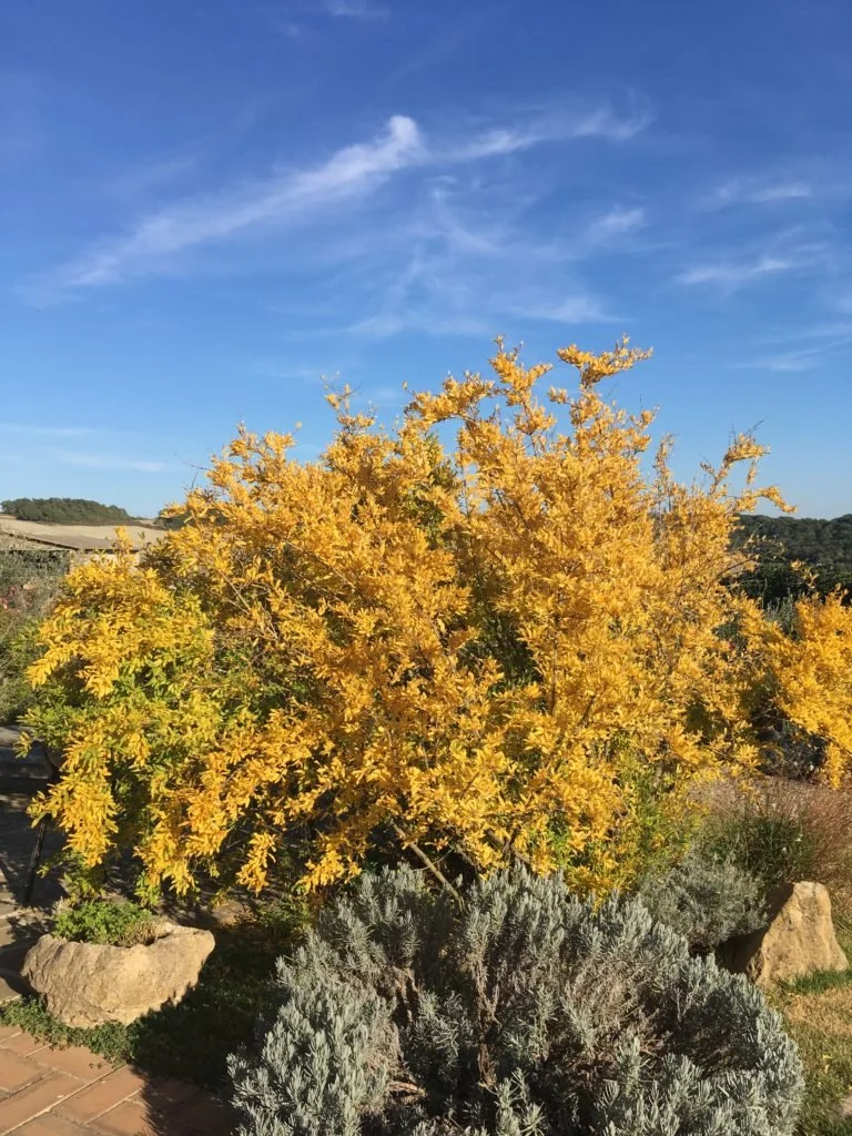 The pomegranate tree is ablaze in a dazzle of gold; its last hurrah before baring its branches. The tree has lived here for two and half years now and, in spite of the fact that it has yet to provide us with a single pomegranate, it has grown sturdy and full. Rooted on one side of our little terrace it provides us cover in the summer months when we take the sun naked. Not that the farmers are likely to want to see us in our threadbare bathing suits! In the spring it protects us form the early morning chill as we eat breakfast in its embrace.