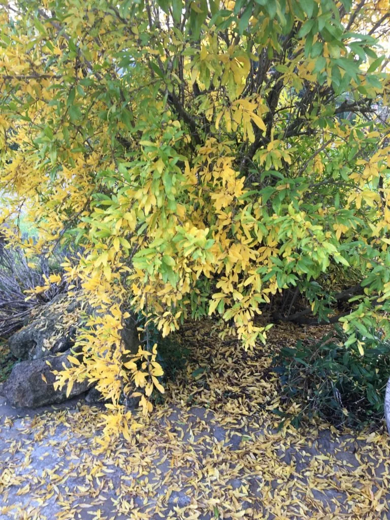 Evening has arrived and with it, a chill breeze. I watch as the pomegranate sheds its leaves. Like tears of gold, they fall.