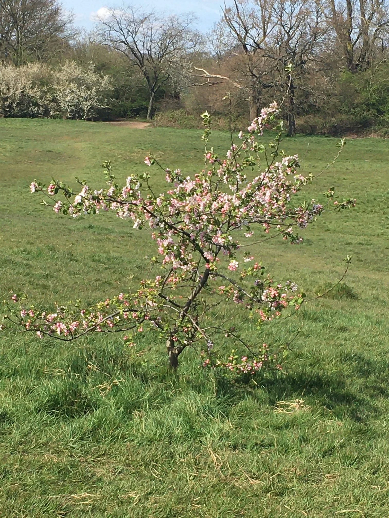So let’s turn the phrase, “The nature of luxury,” around and call it the luxury of nature. That little blue forget-me-not pushing through a crack in a wall. The puff of a white cloud blithely sailing across the blue sky. The satin petals of a magnolia tree strewing the sidewalk. On our walk on the heath this week we came across this little cherry tree which had obviously self-seeded. It is socially distanced from all the other trees and yet is full of itself.