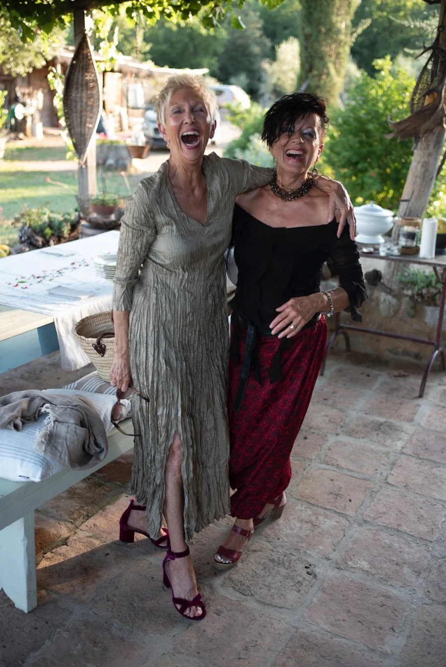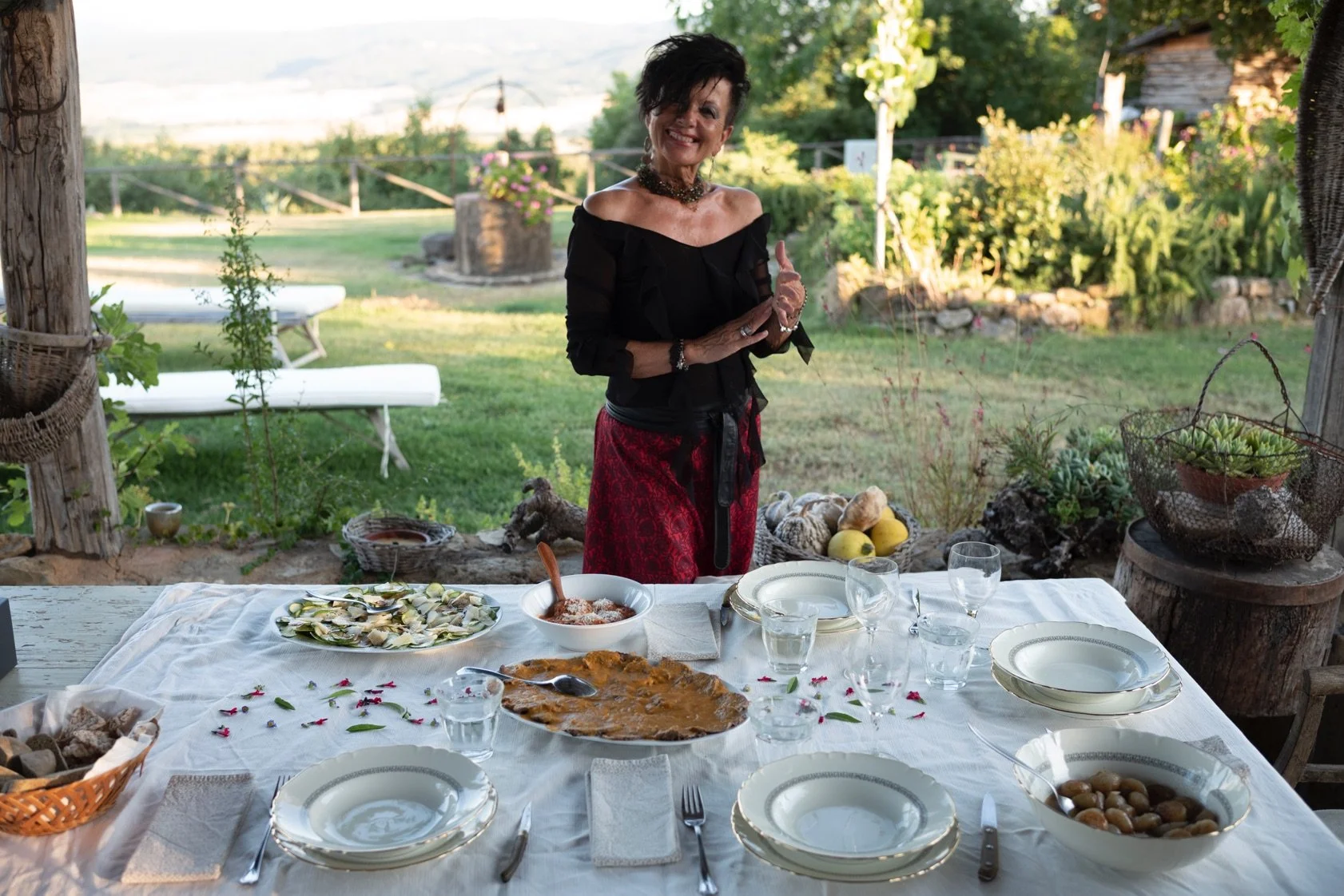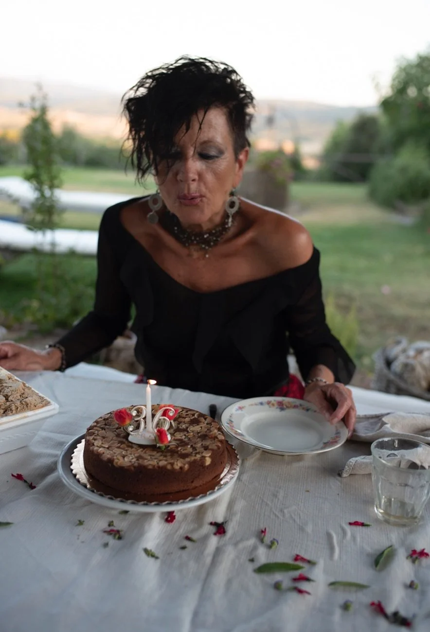 Last Friday we celebrated our friend Luana’s birthday with a simple dinner for four; Luana and her husband, Gianni, plus Joel and I. It was a perfect Tuscan evening; an occasional breeze, golden light, the table set with an old linen cloth strewn with petals picked from their garden. Dinner was a simple meal of shaved zucchini dressed in pesto, caramalised baby onions, beef carpaccio in a delicate bolognese sauce and for dessert a chocolate almond cake from a local patisserie with dollops of coffee ice cream from the village gelateria. We’ve been friends for 25 years, weathering hard times and celebrating the good, so the evening was laced with memories and laughter as we watched the sunset illuminate the landscape from within, the hills glowing with a gold so vibrant it seemed to pulse. As the light faded, Gianni lit candles in the glass jars he’d hung from the branches of the surrounding olive trees.