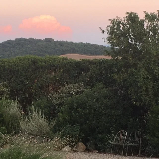 Perhaps that’s what called me out here this afternoon. By leaving the confines of the house I placed myself in a reality I’ve been trying to avoid. Turns out that sometimes reality is as bad as you though it would be! And yet…reality is constantly changing. Yes, the heat has at time felt unbearable in the last hour, but there have also been moments when I was so lost in writing, in searching for something positive and encouraging, that nothing else existed; the search became the reality. And now an intermittent breeze, while not cool, at least brings movement; to the leaves above me in the holm oak, to the blonde tufted grasses, to the branches of the olive trees. And with this movement comes appreciation for the nature that surrounds me. It may not be the one I long for; the one of meadows and moats, of hedgerows and wildflowers, but it is nature none-the-less and I am humbled by my good fortune to be in it.