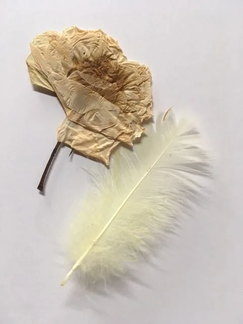 These two little gifts from nature made me think about their lives. I wondered what sort of bird, and is it still alive? I marveled at the rose that had defied the odds and pushed itself forward into December, awareness and acceptance no part of its existence, only action. The trajectory of these two things is miraculous. A feather drops from a bird in England, its flight seemingly ended, but no. It is saved by a friend and flies inside an envelope to me where is flutters to my feet, continuing its journey in a flight of my imagination.