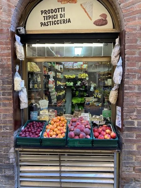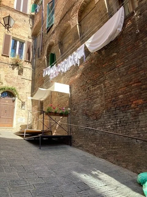 It was a gorgeous sunny morning and having a couple of hours left before our dental appointments we strolled the cobbled back streets of the medieval city, happily noting that, unlike the deserted streets of a month ago, now life was bubbling up again. Shops were opening. Bars had the cheerful sound of chatter and espresso machines. Tiny grocery shops proudly displayed their local produce; fruits and vegetables arrayed in wooden crates as tender as babies in bassinets. Early morning sunlit laundry wafted gently from window sills and outside each ancient door a neat bundle of household rubbish would soon be carted away.