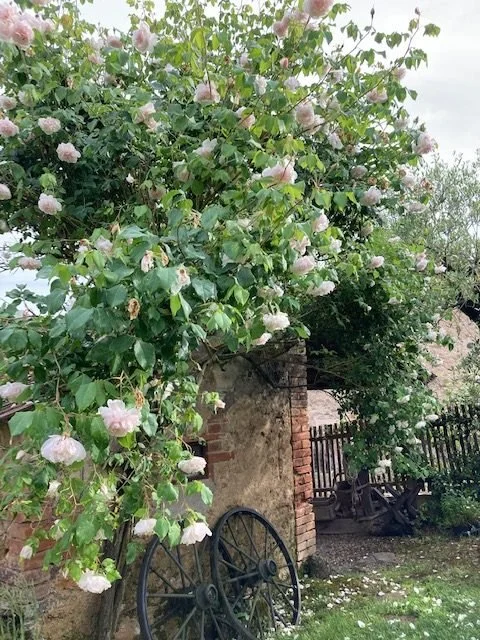 I just came in from the garden wearing my hooded raincoat and old gardening boots. It has rained all day, nice and steady, and I wanted to be out in it, the way I loved to walk in the rain as a child, albeit one old enough to be allowed out alone. The garden was bejeweled with raindrops; the rose tree’s blossoms heavy with rain now bowing to the earth. In the Mediterranean border, I stop to pick roses for the mantlepiece and my daughter’s little vase. A small, summer fire chuckles in the hearth, the door open to birdsong. Although my mouth is tender the pain and horror have left and isn’t that how it all comes and goes?