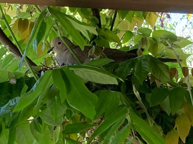The rain has stopped now, a fresh breeze comes in the open door and stirs the fire. Sparrows are cheeping away in the hedges. In about 15 mins, finally settled into their nests and with nothing left to say, the cheeping will abruptly cease, until dawn. I go out to the pergola in front of the house to say good-night to the nesting mourning dove who is now almost completely invisible amongst the wisteria. I notice she is sitting higher in the nest so the eggs much have been laid.