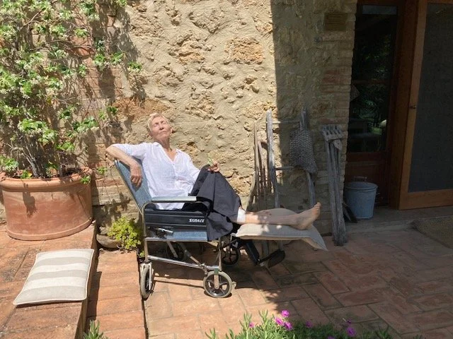 I stare at this blank page. Minutes pass. Sentences begin to form, and immediately unravel. I am looking for an entrance that will lead me to an outcome that makes sense, that allows me to accept this reality: the one that began on a sunny afternoon in Siena and ended with my right femur broken in 2 places, pain beyond measure, hours in the emergency room until an X-ray was taken and my leg then put in traction for a week before surgery on our Wedding Anniversary; surgery for which I was anaesthetized from the waist down but throughout which I remained conscious, while an 8″ titanium plate was attached to my femur with 8 screws!